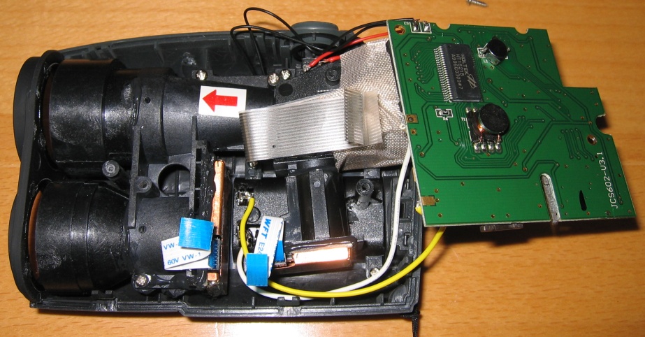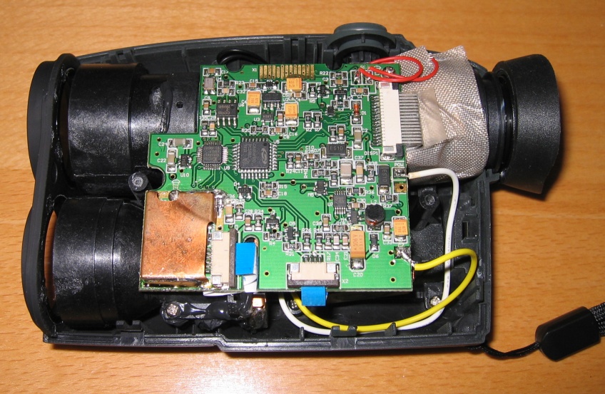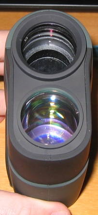 Frontansicht : Man erkennt die obere Linse wo das Auge das Objekt sieht und wo der Laserstrahl ausgesendet wird. Die Untere Linse ist mit der Empfängeroptik verbunden (vermutlich ne APD Diode).