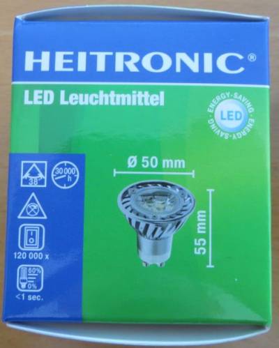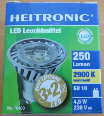Der erste Ausfall einer LED Lampe bei mir - eher ungewöhnlich finde ich … Es geht um die Heitronic 16400 GU10 Sockel für 220V mit 3*2Watt LEDs, 4,5W Leistungsaufnahme. Gekauft 10/2012 und kaputt 03/2014. Aufgemacht und nachgeschaut, die LEDs funktionieren noch, nur die Elektronik hat sich verabschiedet. Laut Packung sollte die Lampe 30.000h halten. Wenn man an 519Tagen Laufzeit je 12h ansetzt (8Uhr abends bis 8Uhr morgens) kommt man auf grob 6.000h Laufzeit …. In der Wandlampe habe ich 2 dieser Heitronics verbaut, eine davon läuft noch. Mal schauen wann diese Ausfällt. Anbei noch ein paar Bilder.