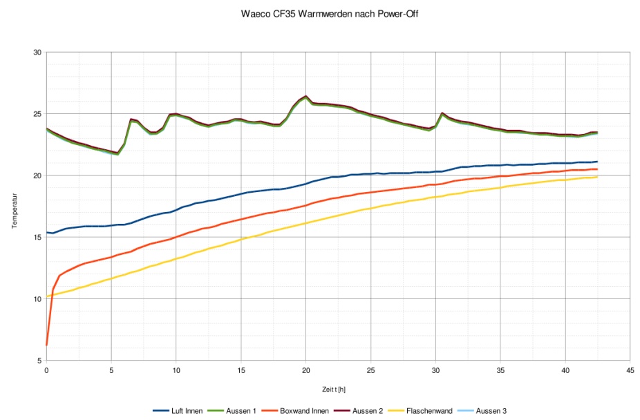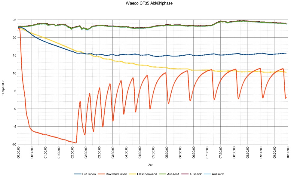 Los gehts ! Strom an und mitschreiben. Man kann schön das erste Hochlaufen beobachten und danach das zyklische Nachkühlen. Da die Flaschen alle auf Raumtemperatur waren und der Wärmeaustausch nur schlecht stattfand, wurden die Flaschen langsam gekühlt. Ergo : Am besten gleich kalte Flaschen hineinstellen und die Aussenseiten der Flaschen in thermischen Kontakt mit der Kühlbox bringen…