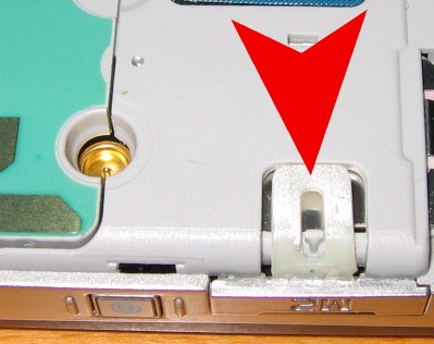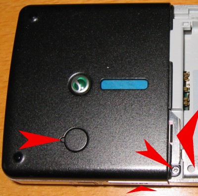 2. Mit einem spitzen Gegenstand die Abdeckung der Antennenbuchse herausholen sowie SIM-Karte, Speicherkarte und die TORX-Schraube unten rechts herausdrehen :