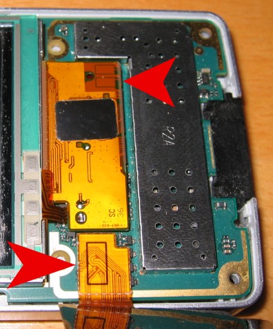 8. Mit der Kante einer Plastikkarte vorsichtig die beiden Folienverbinder herausheben und Display beiseite legen :