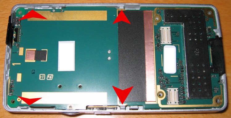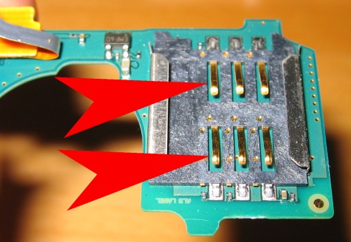 13. Platine herausnehmen. Auf der Unterseite ist der SIM-Karten Halter. Vorsichtig alle 6 Kontaktfedern wieder etwas weiter nach oben biegen so das diese mehr Kraft auf die SIM-Karte ausüben.