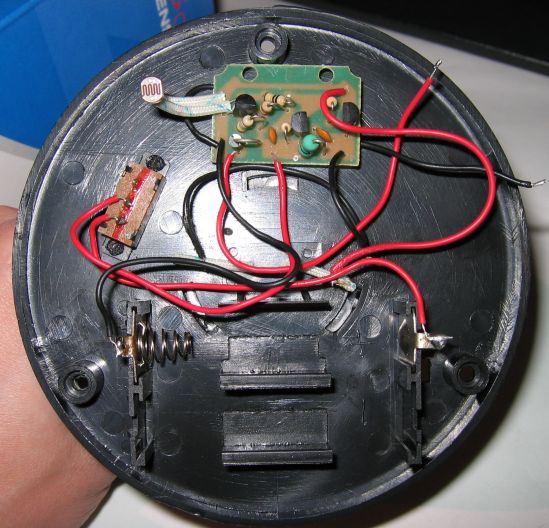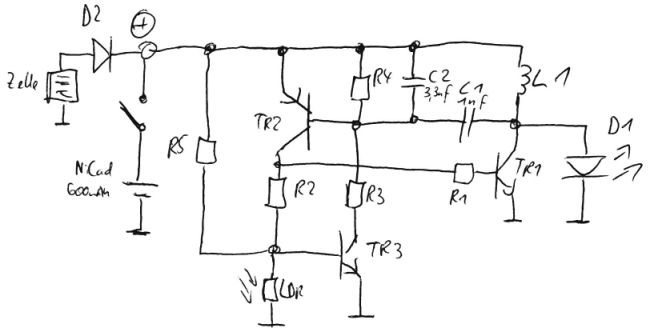 Dazu kommt noch eine einzige 600mAh NiCad Zelle zur Pufferung. Die LED in weiß ist auf der Rückseite. Der LDR kommt nach oben in Richtung Solarzelle.