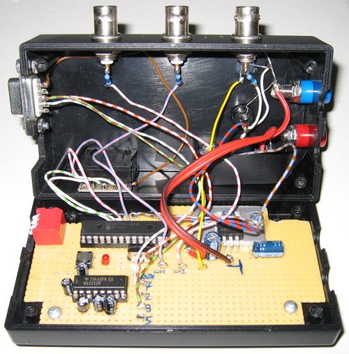 Im wesentlichen nur ein PIC18F2550, 5V Spannungsregler, RS232 Pegelwandler sowie ein paar Tasten, Buchsen und Schalter. Aufgebaut wie immer auf Lochraster. Der freie Platz unten rechts auf der Platine war nur Vorhalt für Erweiterungen.