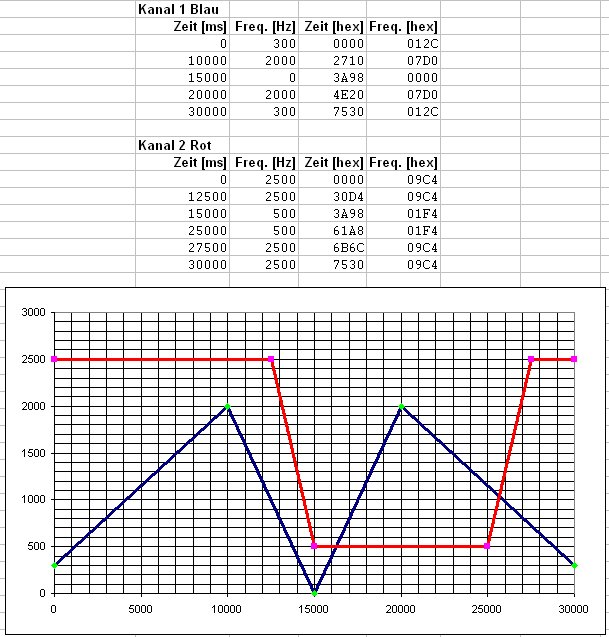 Zuerst muss an sich überlegen, welche Kurvenformen man abfahren möchte auf beiden Kanälen. Bei ständiger wiederholung (Repetitive) sollte der letzte Datenpunkt auf der selben Frequenz sein wie der erste. Dazu gilt das für bei Frequenztabellen der Endpunkt gleich ist, d.h. eine Tabelle darf nicht bei 10sec. aufhören und die andere erst bei 25sec.