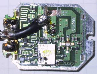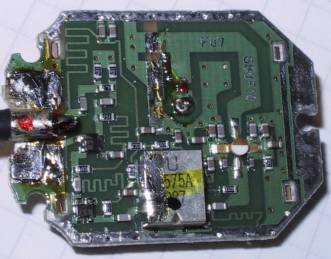 Und das Koaxkabel mit der Masseverbindung ausgelötet. Nun wird im Bild oben die Streifenleiterbahn an 2 Stellen durchtrennt und das Kabel wieder angelötet :