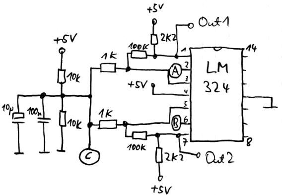 Die Schaltung ist simpel und braucht nur 2 OP's. Da bei mir leider nur ein LM324 rumlag musste dieser herhalten …