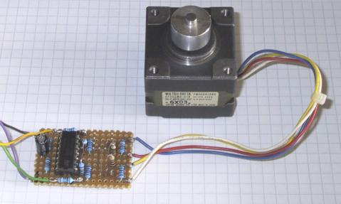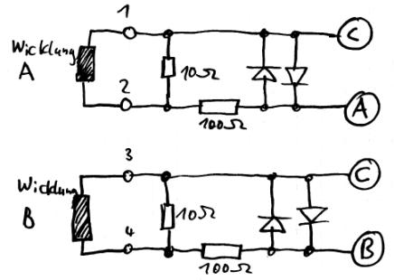 An diese Grundschaltung kommt nun die Impulsgewinnung aus den beiden Windungen des Steppermotors: