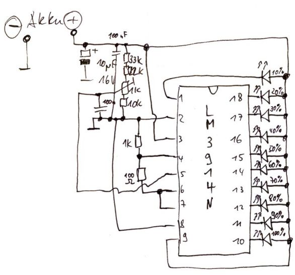 Da bei Lithium-Ionen Akkus der Ladezustand „relativ“ gut an der Klemmenspannung abgelesen werden kann, musste eine Anzeige her mit LM3914N und 10 LEDs. Aus dem Spannungsteiler ergibt sich die untere und die obere Spannung welche den 0% und 100% entsprechen.