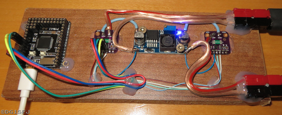 Auf der linken Seite das Micropython Pyboard1.1 mit USB Anschluss welches auf dem PC eine Serielle Schnittstelle und ein Flashdrive erzeugt. In der Mitte ein typisches DCDC Wandler Modul sowie links und rechts die INA Module.