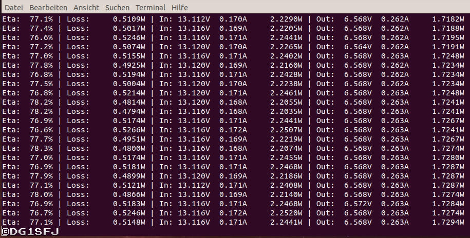 Alles was jetzt noch fehlt ist ein kleines Python Programm welches Strom/Spannung am Ein und Ausgang ausliest und daraus die Werte Wirkungsgrad, Eingangsleistung, Ausgangsleistung, Verlustleistung, Eingangsspannung/Strom, Ausgangsspannung/Strom auf der seriellen Schnitte ausgibt.