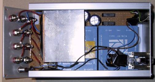 Ein Blick ins Innere. Der Aluwinkel links ist ein gemeinsamer Kühlkörper für alle Spannungsregler. Und da in meinen Schaltungen ohnehin (ausser im Fehlerfalle:-) nie große Ströme auftreten, reicht das völlig aus.
