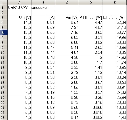 Rein aus Interesse habe ich die aufgenommene elektrische Eingangsleistung sowie die abgegebene HF Sendeleistung an 50 Ohm bei Dauerstrich CW unter verschiedenen Betriebsspannungen durchgemessen. Ganz interessant finde ich :