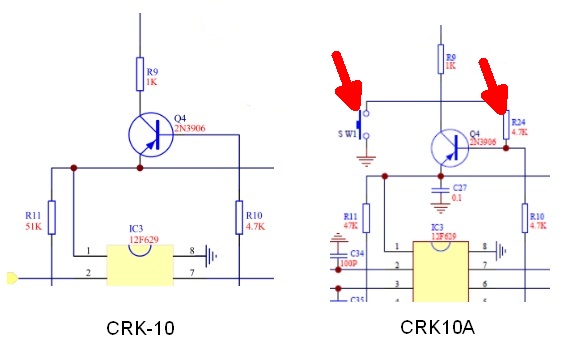 Kurz nach Erscheinen des CRK10 kam schon ein Update zum CRK10A. Der Unterschied besteht in einer zusätzlichen „CFM“ Taste, bedeutet „Confirm“. Damit kann getestet werden ob das Empfangssignal sich im richtigen Seitenband befindet (Tonhöhe geht runter oder verschwindet). Wenn die Tonhöhe ansteigt, befindet sich die rufende Station im falschen Seitenband und es wird kein Kontakt zustande kommen. Damit ich dieses nützliche Feature auch habe, reicht ein Taster+Widerstand+Draht aus.