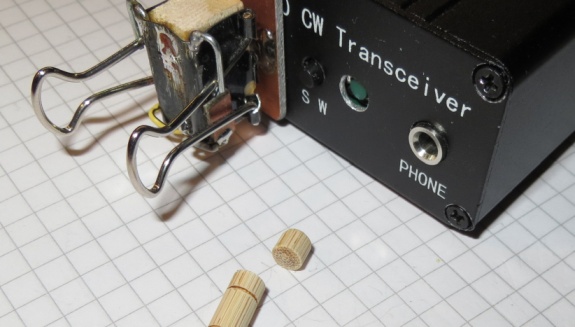 Brauchen wir nur noch eine Taster-Verlängerung. Die läßt sich am besten aus einem Ess-Stäbchen mit einem scharfen Messer runterschneiden und per Sekundenkleber auf die Taste aufbringen. Sieht rustikal aus und passt zum CRK-China-Design