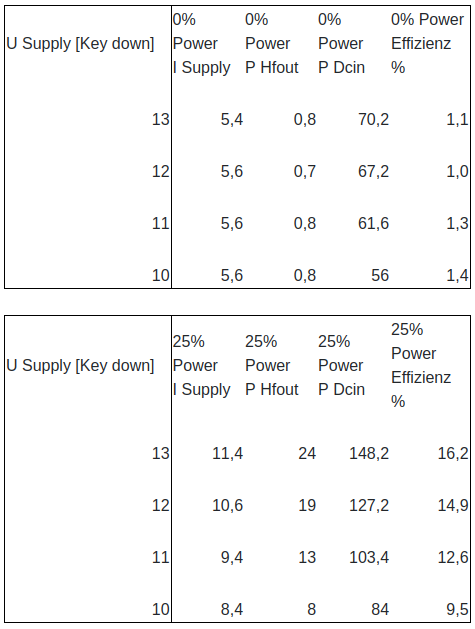 Icom IC7000 20m Band, Mode FM Spannung U direkt am Eingang des TRX gemessen I in derVersorgungsleitung, PHF an 50Ohm