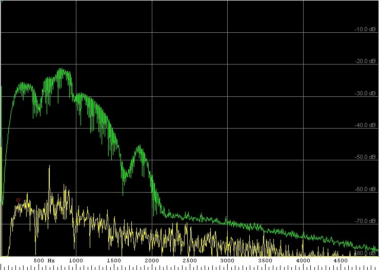 Spektrumanzeige von -80dB..0dB sowie von 0…5kHz 22050 Hz Samplerate mit 16 Bit Stereo FFT Decimator 1 mit 16384 Bit Input Size Hanning