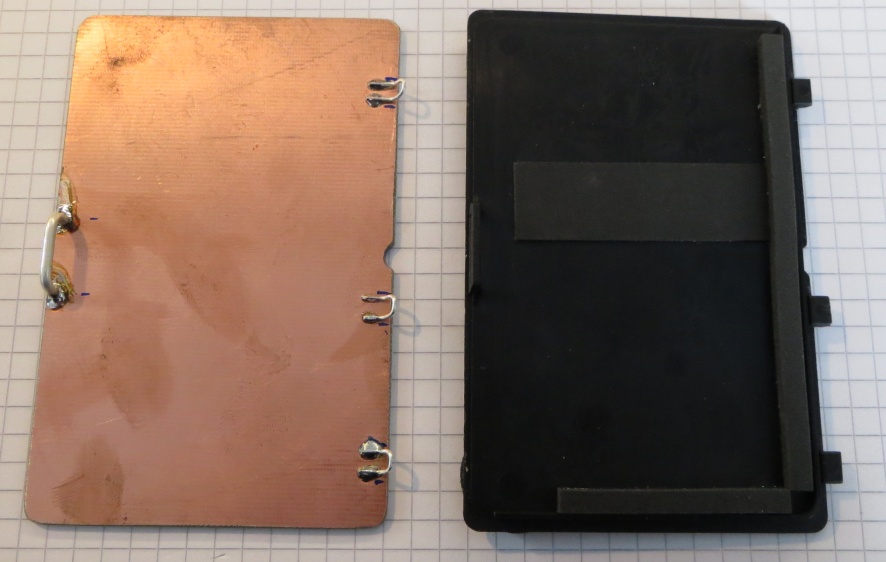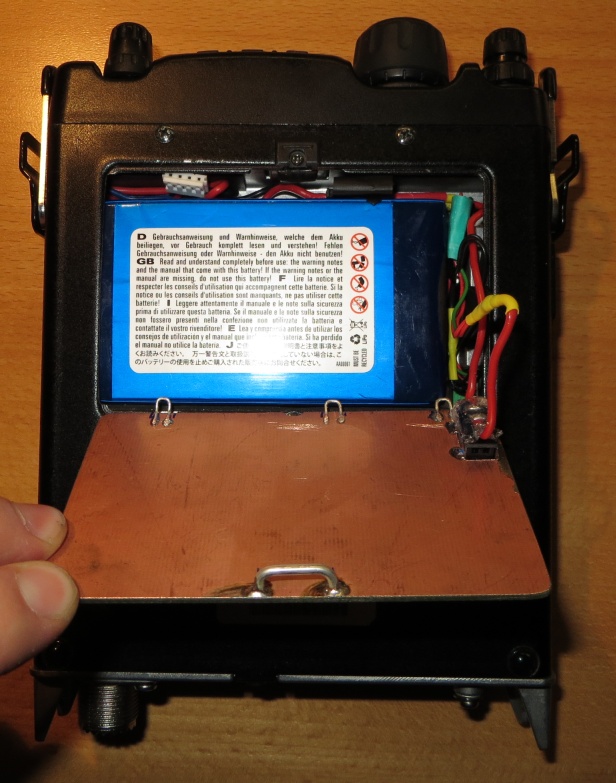 Beim stöbern im Internet bin ich über Jörgs Seite gestolpert (DL1DLF). So ein LiPo Akku musste auch in meinen FT817 rein ! Kurz überlegt und einen „LRP VTEC TX Senderakku 11,1 V 3600 mAh Nummer 79981“ bestellt. Nach kurzer Planung stand fest, der Lipo sollte per Schalter abgetrennt werden vom Gerät. Hintergrund : Damit der Lipo nicht im Gerät geladen wird gaukeln wir dem FT817 ein Batteriepack vor. Das Design des FT817 saugt aber permanent aus einem Batteriepack etwas Strom auch im ausgeschalteten Zustand. Da ich den Batteriefachdeckel nicht verbasteln wollte wegen einem Schalter habe ich kurzerhand einen neuen Deckel nachgebaut aus einseitig Kupferkaschiertem Material und etwas aufgelötetem Silberdraht.