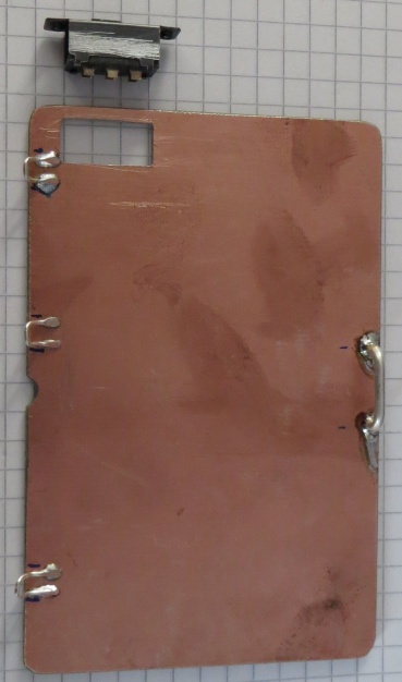 In den Deckel kommt jetzt ein rechteckiges Loch für den Schalter. Da ich keinen passenden Schalter fand mit niedriger Bauhöhe musste etwas gefummelt werden … Füsschen unten abgeknippst, Plastikteil des Schalters gekürzt und Lack an der Seite entfernt zum festlöten am neuen Batteriedeckel.
