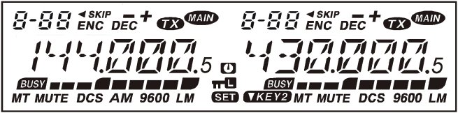 [Stelle1] [Stelle2] [Stelle3] + [MHz-Punkt*] + [Stelle4] [Stelle5] [Stelle6] + [kHz-Punkt*] [5kHz*] + [SPACE] + [S] + [0..9] + [! fuer Busy] *falls nötig