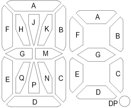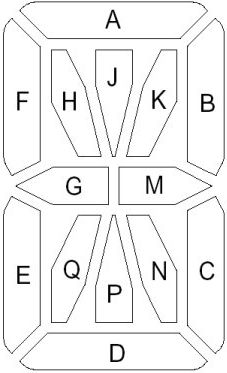 Für die 13-Segment-Anzeige (J+P kombiniert) sowie 7-Segment-Anzeige gilt folgende Benennung:
