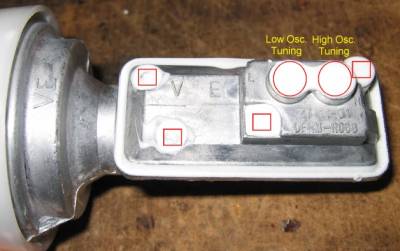 Das Alu-Druckgussgehäuse ist mit ?Silikon? versiegelt. Das weiße Material muss überall herausgekratzt werden. Unter den Rechtecken verstecken sich die Schrauben fürs Gehäuse. Die Abstimmschrauben sind unter den Runden Markierungen :