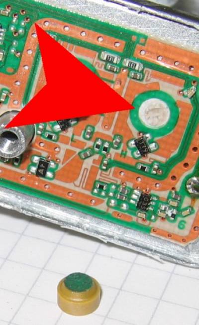 Unser Ziel ist nun, das wir 10,2GHz auf 1,2GHz mischen. Dazu muss die Resonanzfrequenz der Resonatorpille verkleinert werden. Das geht nur mit zusätzlichen Material - und das ist unsere zweite Pille. Diese mit einem Fräser oder Schleifpapier dünner feilen. Dann messen ob die Frequenz schon halbwegs stimmt, falls nicht weiter fräsen. Die Befestigung geschieht jeweils mit Sekundenkleber von der Seite auf die Original-Pille.