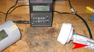 Nun bauen wir uns den Messaufbau. Mit unserem zum Sender umgebauten LNB senden wir auf 10,2 GHz einen Dauerträger. Unser Empfangs-LNB wird nun DC entkoppelt mit einem Frequenzzähler verbunden. Damit sehen wir gleich auf welcher Frequenz gerade gemischt wird.