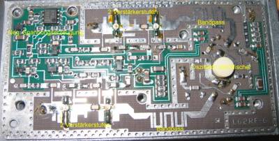 Jetzt das schönste : Die eigentliche HF-Platine. Man sieht die negative Spannungserzeugung sowie die Bauteile für die Gate/Drainspannungen der 4 FETs. Nach den Verstärkerstufen kommt noch ein gedrucktes Bandpassfilter. Danach geht es zum Mischer und dem DRO-Oszillator mit der Keramik-Pille :