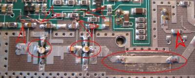 Im Horizontal-Teil werden die beiden Transitoren ausgelötet und verkehrt herum wieder eingelötet. Die Gate und Drain-Spannungen welche von oben kommen, müssen gekappt und auch getauscht werden (Ersatz durch kleine Drahtbrücken). Zum Schluss wird hier auch noch der Auskoppel-C entfernt, das Bandpass-Filter weggekratzt und mit einem Stück leitfähigen Klebebands überbrückt :